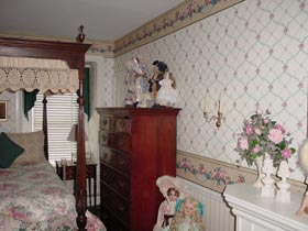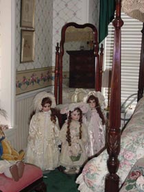 | 寝室(ベットルーム)はビクトリアンで女性の憧れキャノピーベット(天蓋付ベット) | テディベア同様、アンティークドールも好きだそうです。 |