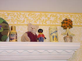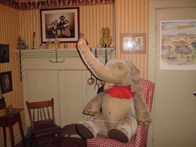 | 階段を降りるとシュタイフ社製の大きなアンティークの象さんがお迎えしてくれました。倒れるのでイスに紐で縛っているそうです。 | バスルームは日本と違い、オシャレな棚の上に色々飾ってありました。真中のベアはキャサリンさんが最初に作ったプーさん。 |