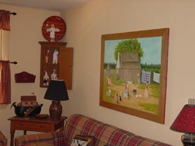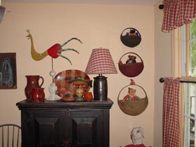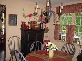 | お部屋毎にテーマが分かれており、リビングと朝食用テーブルは本場のアメリカンカントリーでした。まるで洋書の中に入った感じでした。 | ウインザーチェアやスイカのマット、レッドウエアー(ポテリー)やシャンデリアどこを見ても洋書の『Country Living』そのもの。 |
