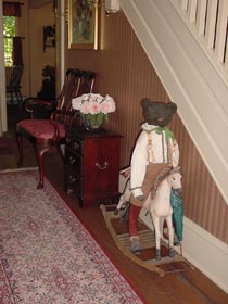 | 玄関のドアを開けるとすぐにアンティーク木馬に乗ったベアがお迎えしてくれました。 ベアもアンティークベアです。 お家に入った第一声はワー凄いでした(笑) |